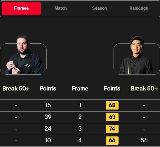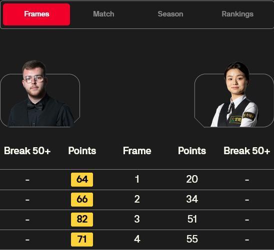 第四时段中,中国香港选手王雨晨打出单杆56分,连胜4局,大比分4-0横扫英格兰选手斯图尔特-卡灵顿,晋级经历赛第二轮。同期段比赛中,白雨露连丢4局,大比分0-4不敌苏格兰选手迪恩-扬,留步经历赛首轮。