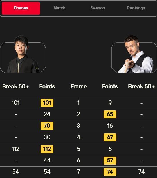 经历赛首日共打出4杆破百,其中3杆来自中国选手:小将巩晨智在对阵迈克尔-霍尔特的首局和第五局中,各打出1杆破百,其中第五局打出的单杆112分是当日的单杆最高分;江俊在对阵阿迈德-阿里-埃尔萨伊德的首局中打出单杆104分。此外,西蒙-布莱克威尔在对阵辛格-查达的第二局打出单杆100分。不外,这3东谈主暂时均未登上历史单杆破百榜。